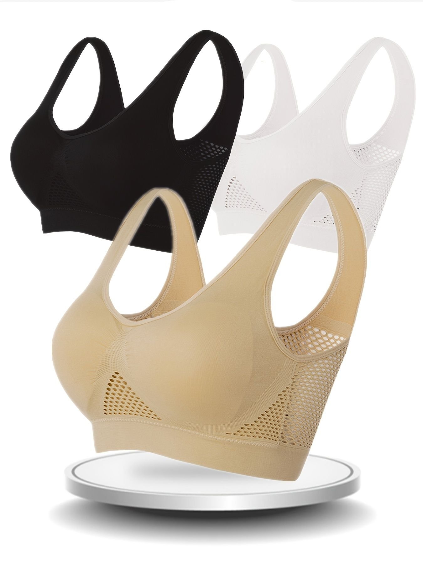 3 Pcs Breathable Solid Eyelet Mesh Hole Vest Sports Bras, Plus Size Non-steel Running Yoga Bras, Women's Lingerie & Underwear