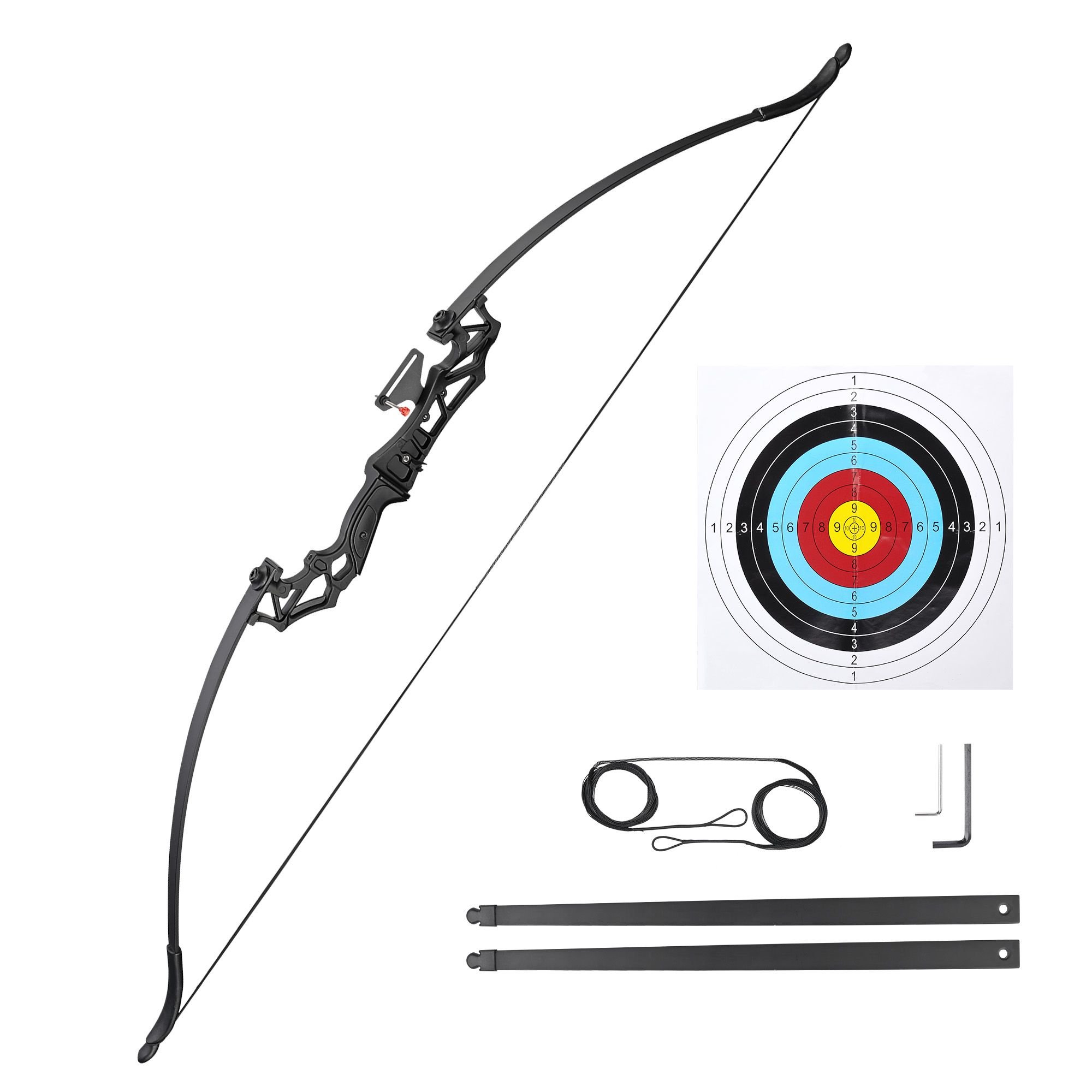 - Takedown Recurve Bow - Includes a recurve bow, spare straight limbs, spare bow string and target paper, designed for right hand shooters, beginners or skilled archers to practice archery skills, which is also perfect for outdoor hunting, horse riding, bowfishing, target archery & more